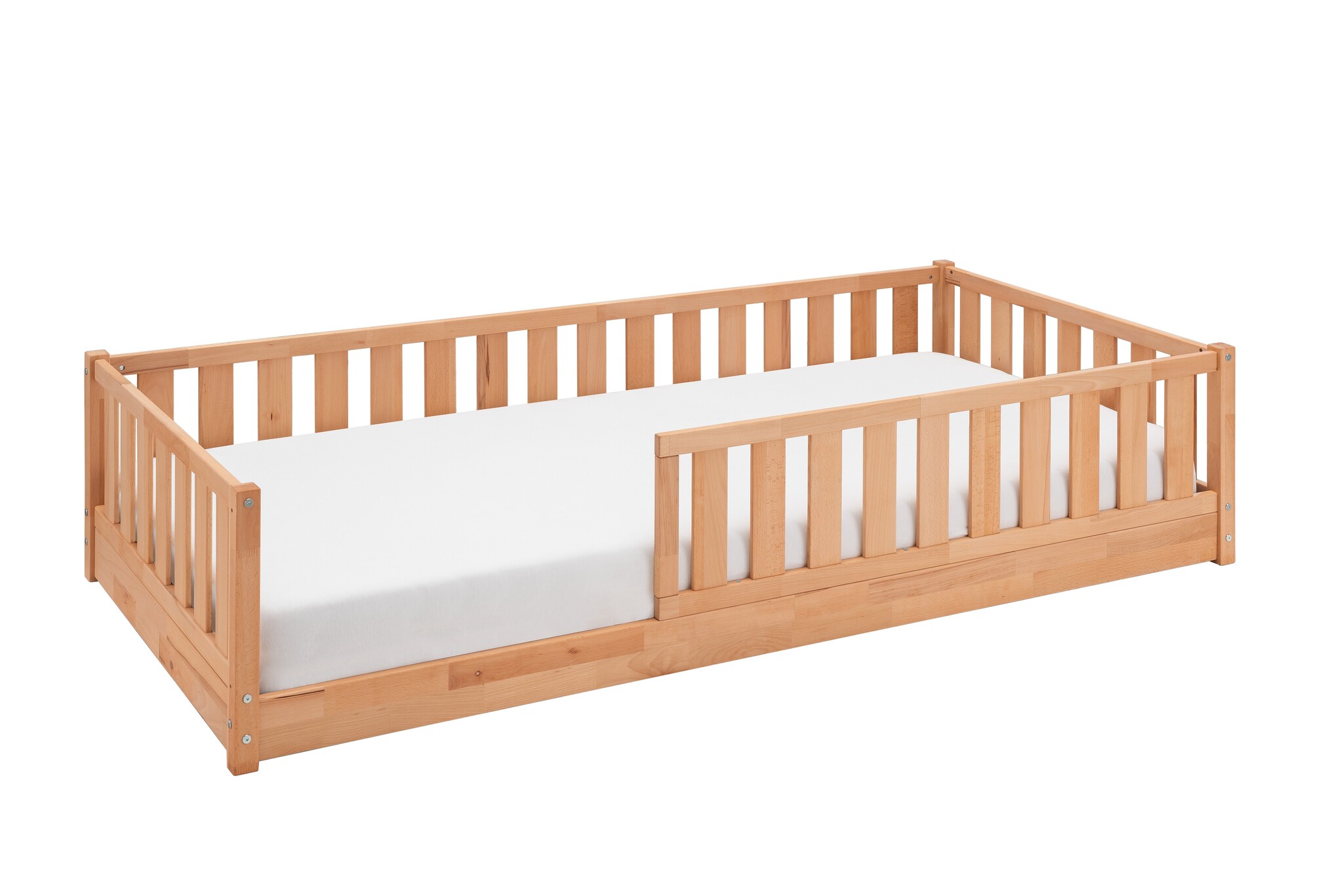 Het Fenna bodembed (ook bekend als vloerbed of Montessori-bed) van 120x200 cm is perfect als peuter- of kinderbed. De balustrades voorkomen dat je kleintje uit bed rolt, terwijl de lage instap ervoor zorgt dat je kind zelfstandig in en uit bed kan stappen