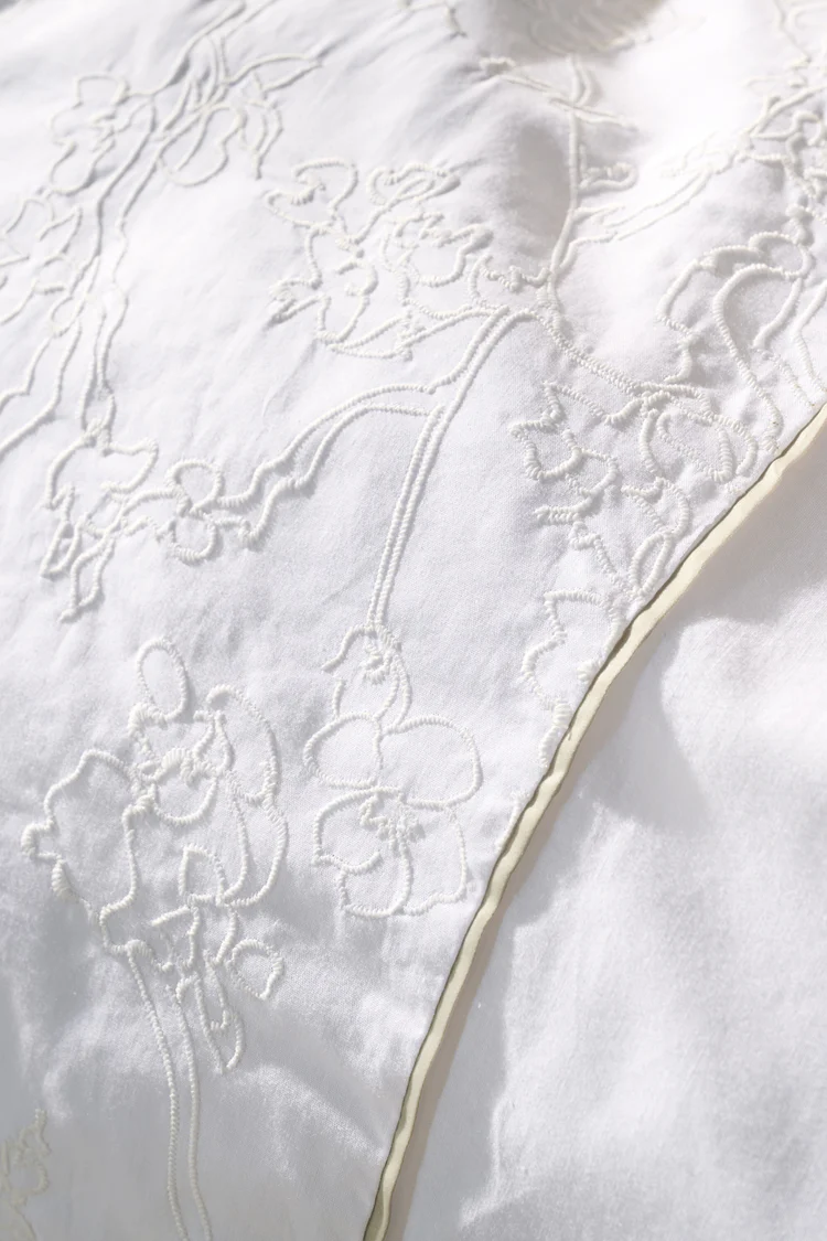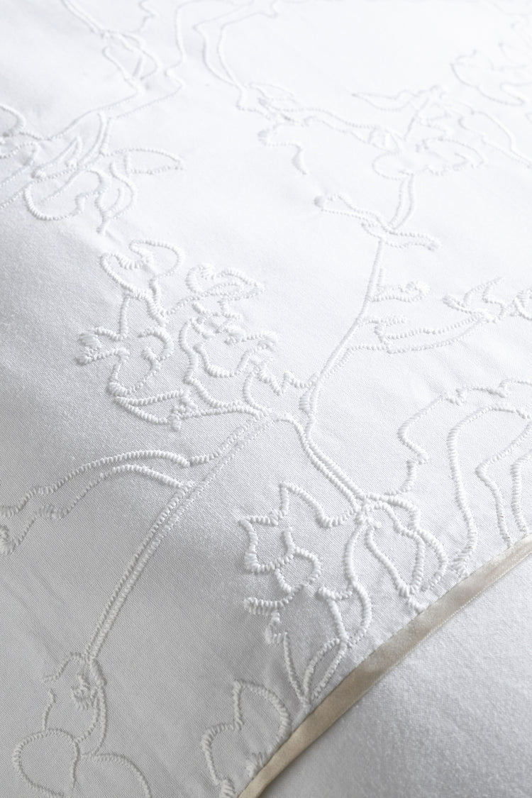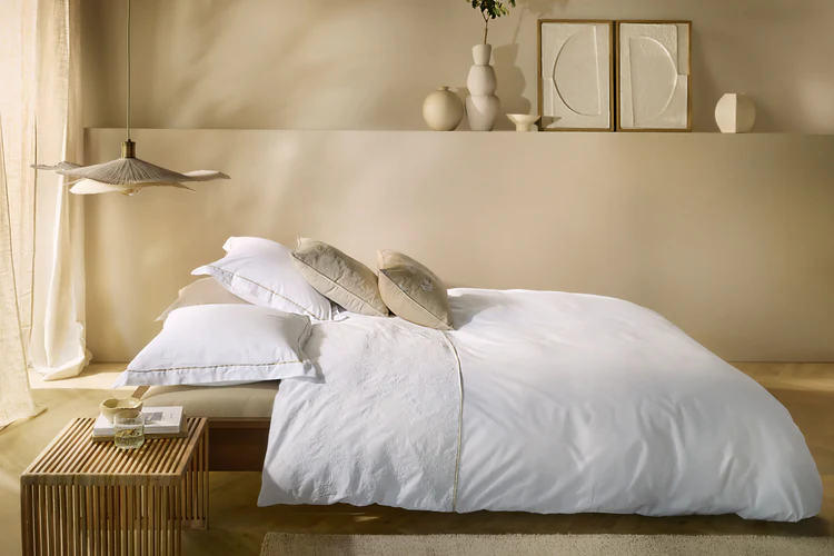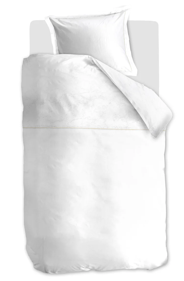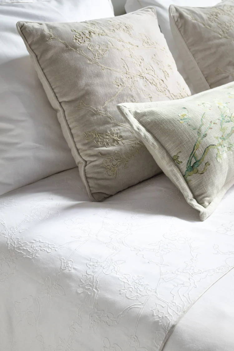 Het dekbedovertrek Broderie Fleuri is onderdeel van de officiële samenwerking met het Van Gogh Museum en straalt pure elegantie uit. Het subtiele, geborduurde bloemendessin is geïnspireerd op Van Goghs schilderij Amandelbloesem en komt prachtig tot leven op de witte ondergrond. De verfijnde lijnen en lichte reliëfstructuur geven het patroon een tijdloze, rustgevende uitstraling. Dankzij de effen achterzijde kies je zelf of je gaat voor een serene of juist een rijk gedetailleerde look. Perfect voor wie houdt van een stijlvol en natuurlijk gevoel om onder wakker te worden.