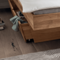 Wat dit eiken bed met lades extra bijzonder maakt, is het zwevende design. Door de slim geplaatste zweefpoten lijkt het alsof het bed echt boven de vloer zweeft. Dit geeft het Astoria bed een lichte en moderne uitstraling die perfect past in zowel een minimalistische als een warme, natuurlijke slaapkamer.