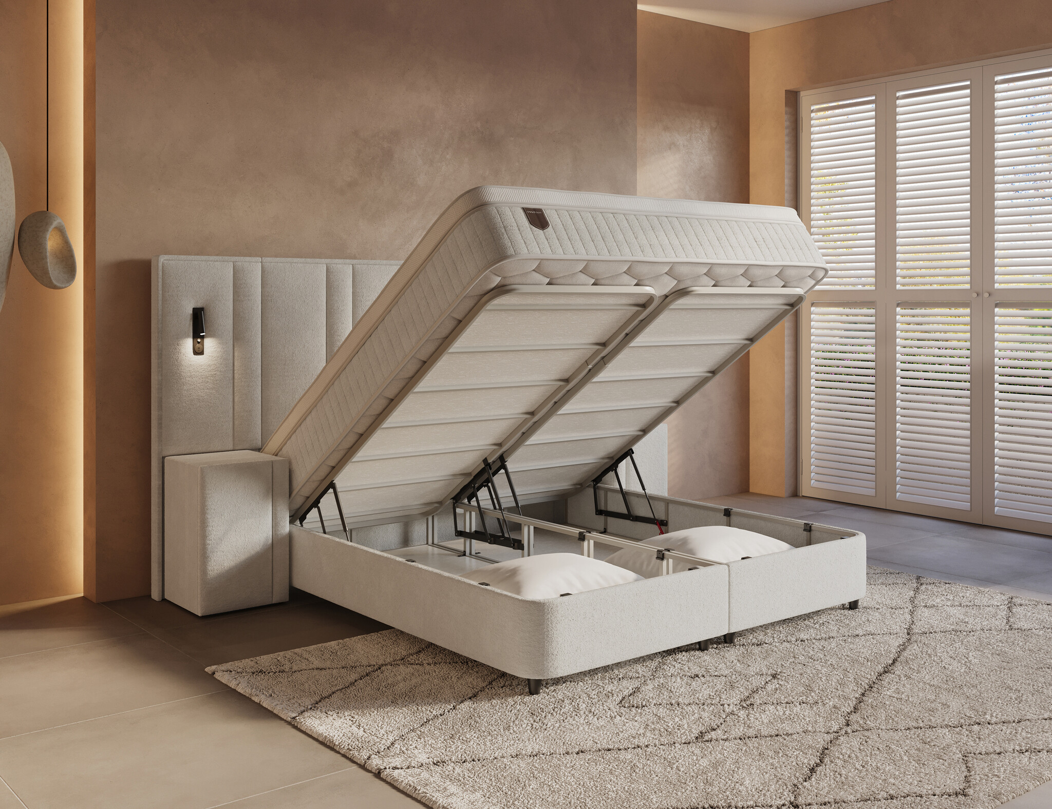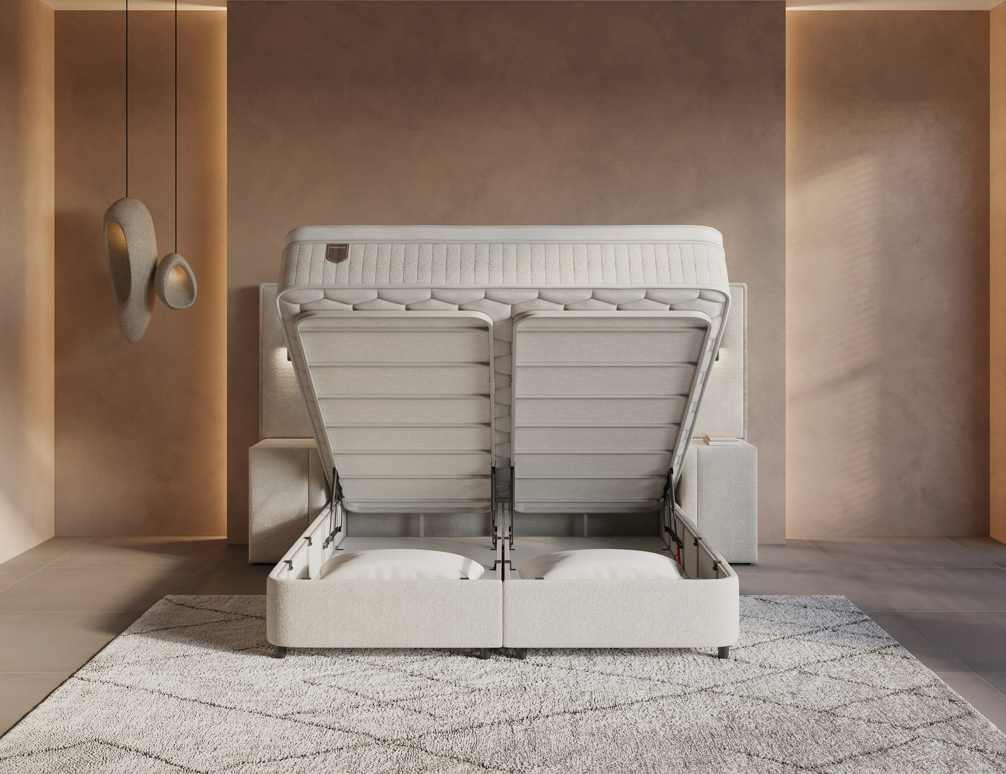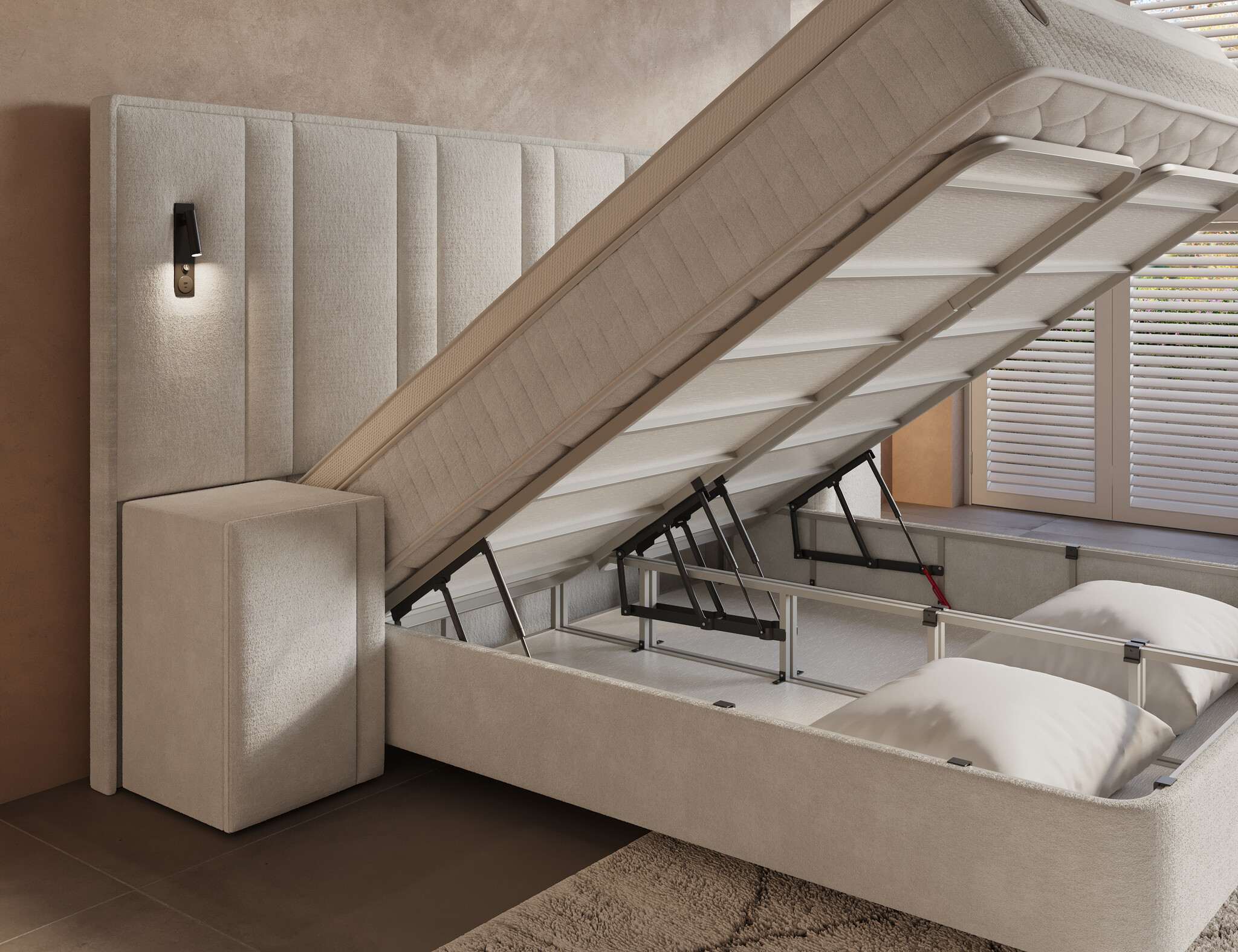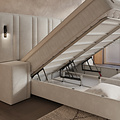 Onder de onderboxen vind je 200 cm aan royale opbergruimte, eenvoudig te openen via vier krachtige gasveren van 1000 newton. Met stevige handvaten en een duurzame, met carbon gelegeerde metalen constructie blijft alles stabiel en veilig. Berg je extra dekens, kussens of seizoenskleding op zonder dat het ten koste gaat van de uitstraling van je slaapkamer.