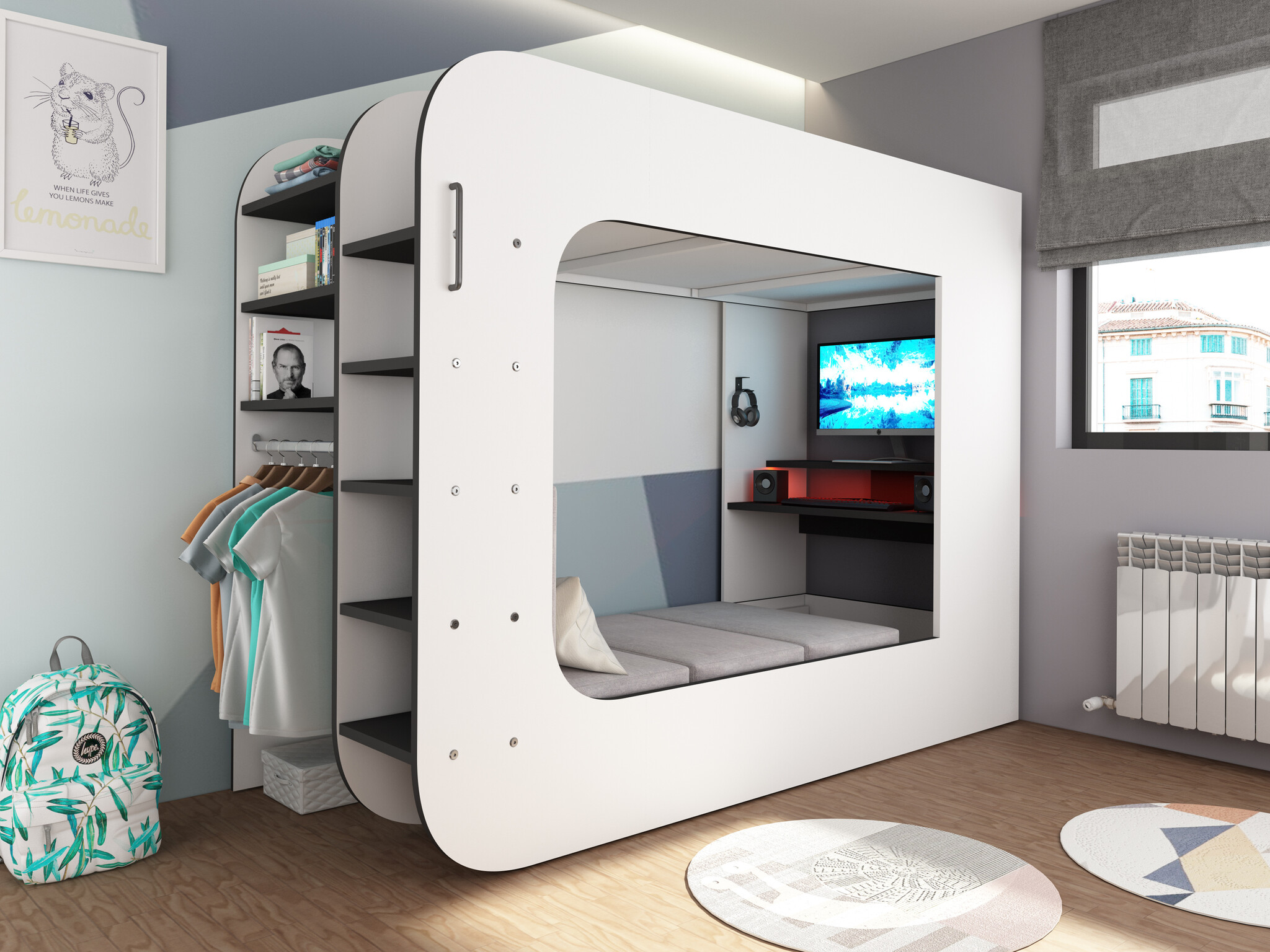 De hoogslaper wordt in Barcelona gemaakt en biedt naast een slaapplek en gamebureau ook een zee aan opbergruimte.