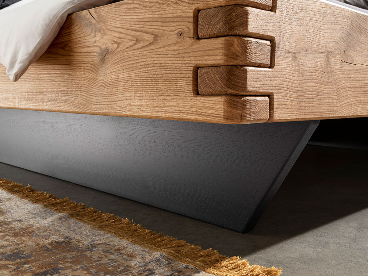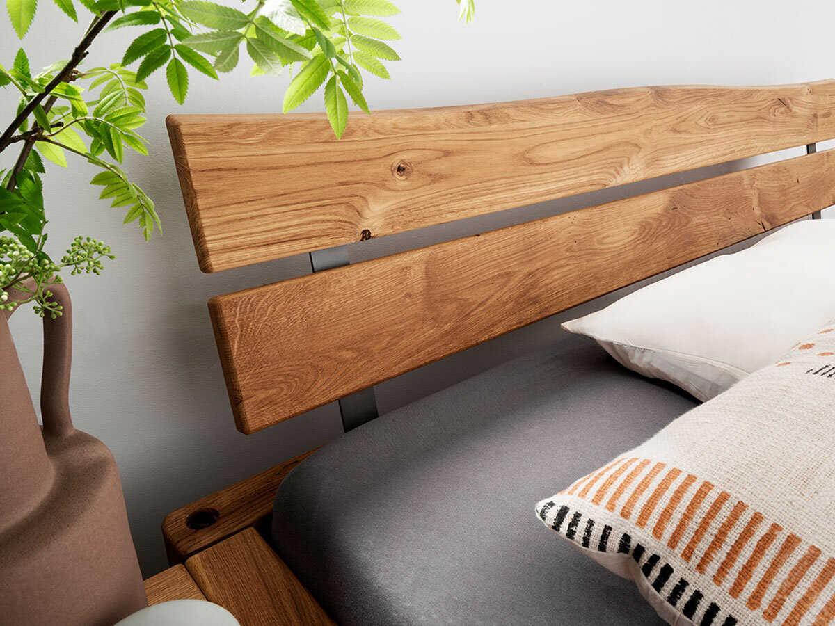 Wilde eik is een levend, natuurlijk materiaal met takken, jaarringen en scheuren. Deze geven het bed een zelfstandige uitstraling en maken het uniek. Om het oppervlak te beschermen, wordt dit bed afgewerkt met olie, die vooral de aard van het hout benadrukt.