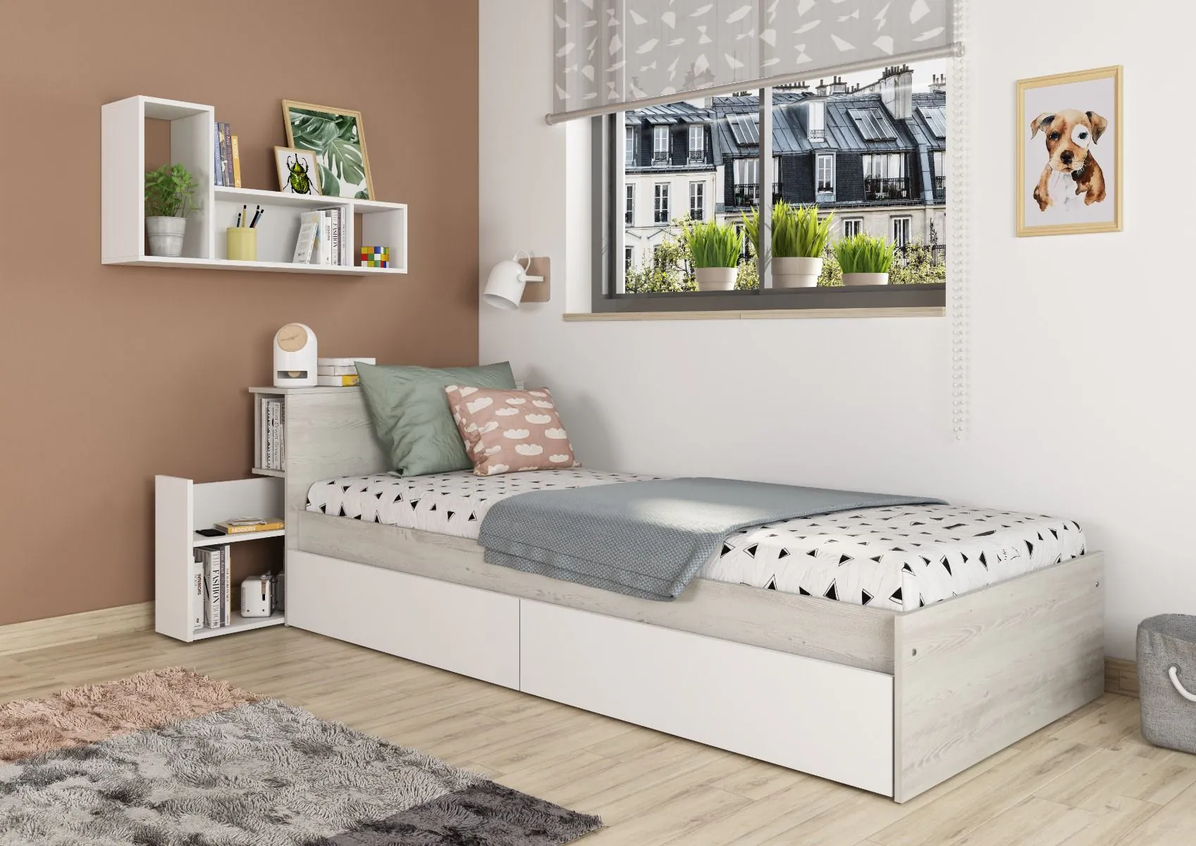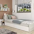 Stevig en praktisch: het Jazz kinderbed van Trasman heeft twee ruime opberglades en een uitschuifbare nis als nachtkastje. Tijdloos design, duurzaam materiaal en perfect voor elke kinderkamer.