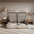 Het hoofdbord van de Arcus Beige is een echte blikvanger. Met zijn ronde, bohemian vormen straalt het warmte en gezelligheid uit, terwijl het toch een luxe en moderne uitstraling behoudt. Het hoofdbord heeft een hoogte van 114 cm en een dikte van 14 cm. De breedte varieert afhankelijk van het formaat: 150 cm bij 140x200, 170 cm bij 160x200 en 190 cm bij 180x200 (5 cm overzijde aan beide kanten). Dit maakt het geheel stijlvol en evenwichtig in iedere slaapkamer.