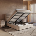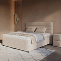 Het bed is volledig gestoffeerd in warme beige Nano-stof voor een elegante uitstraling en rust op stevige zwarte kunststof poten van 12 cm. De ingebouwde topper van 6 cm HR50 koudschuim zorgt voor extra ligcomfort, geschikt voor zij-, buik- én rugslapers. Dankzij de handige gasveren open je de opbergruimte moeiteloos en houd je je slaapkamer netjes en georganiseerd.