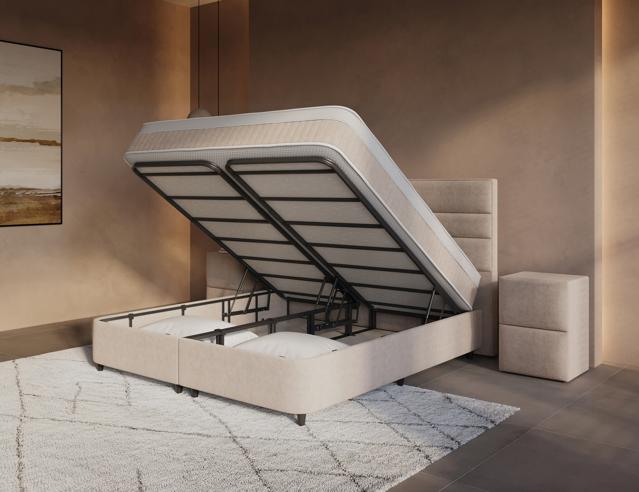 Onder de onderboxen vind je 200 cm aan royale opbergruimte, eenvoudig te openen via vier krachtige gasveren van 1000 newton. Met stevige handvaten en een duurzame, met carbon gelegeerde metalen constructie blijft alles stabiel en veilig. Berg je extra dekens, kussens of seizoenskleding op zonder dat het ten koste gaat van de uitstraling van je slaapkamer.
