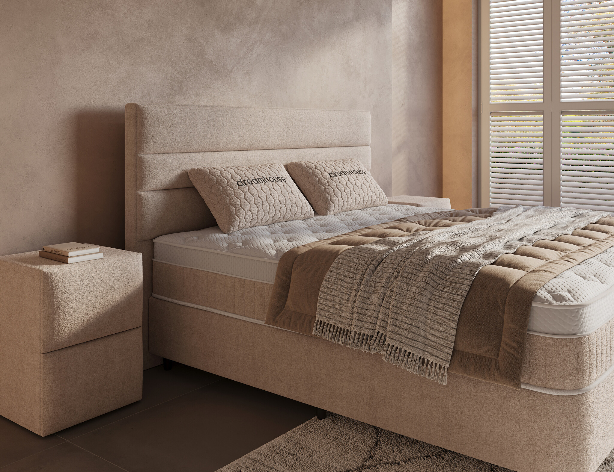 De Dreamhouse Horizon Sand-Beige brengt warmte en rust samen in een stijlvolle boxspring met slimme functionaliteit. De royale vormgeving en horizontale lijnen van het hoofdbord geven het bed een krachtig en modern karakter. Dankzij de zachte Sand-Beige Nano-bekleding voelt het geheel natuurlijk en sfeervol aan – perfect voor elke serene slaapkamer.