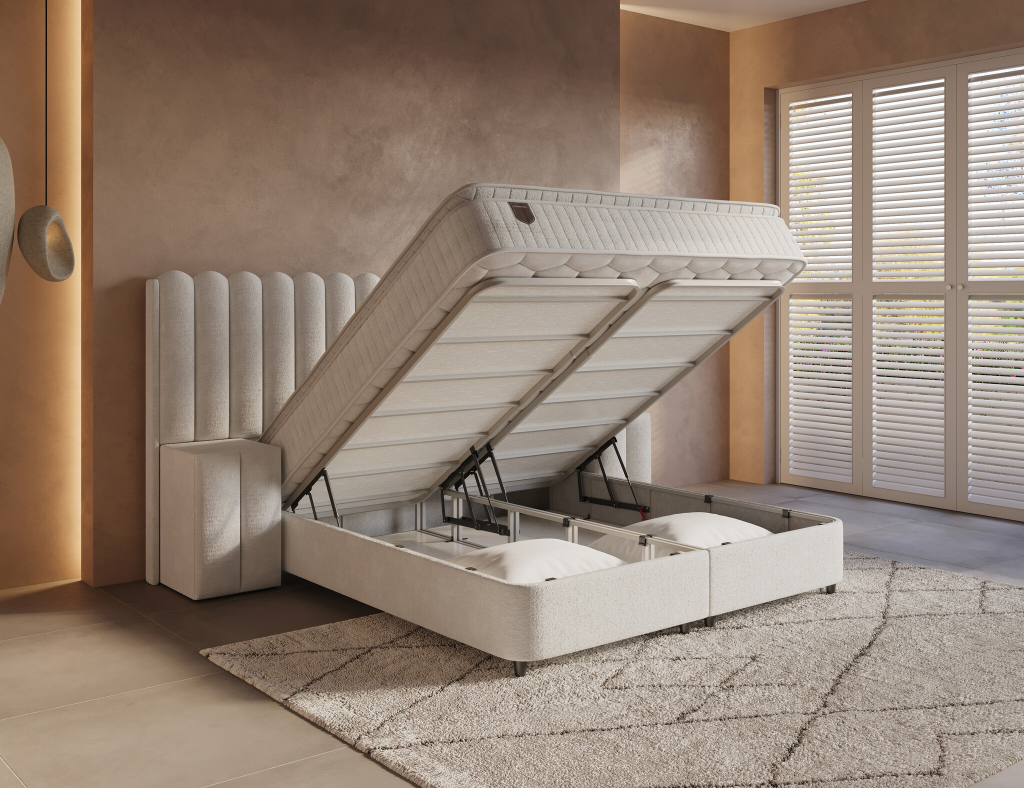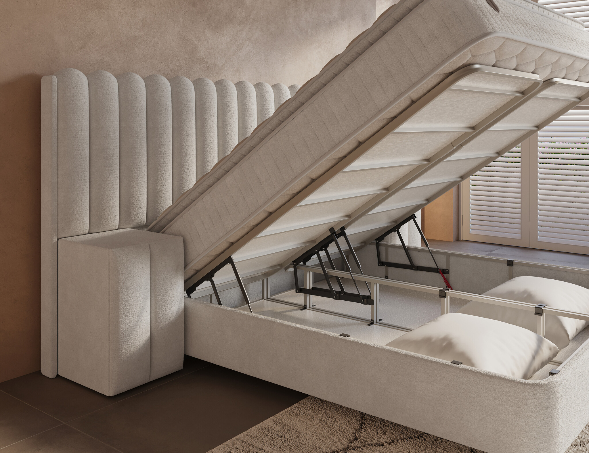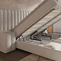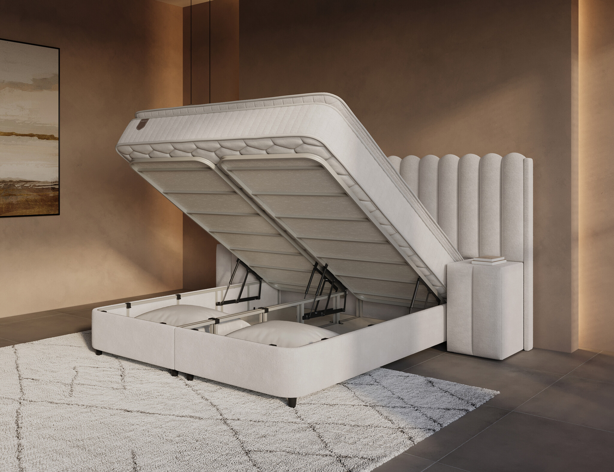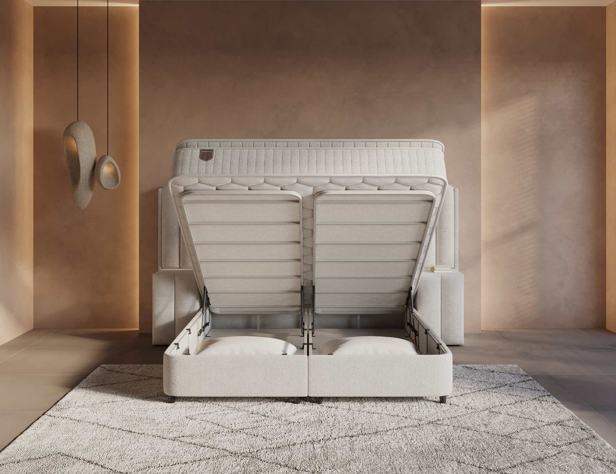 Onder de onderboxen vind je 200 cm aan royale opbergruimte, eenvoudig te openen via vier krachtige gasveren van 1000 newton. Met stevige handvaten en een duurzame, met carbon gelegeerde metalen constructie blijft alles stabiel en veilig. Berg je extra dekens, kussens of seizoenskleding op zonder dat het ten koste gaat van de uitstraling van je slaapkamer.