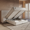 Het bed is volledig gestoffeerd in warme beige bouclé-stof voor een elegante uitstraling en rust op stevige zwarte kunststof poten van 10 cm. De ingebouwde topper van 6 cm HR50 koudschuim zorgt voor extra ligcomfort, geschikt voor zij-, buik- én rugslapers. Dankzij de handige gasveren open je de opbergruimte moeiteloos en houd je je slaapkamer netjes en georganiseerd.