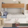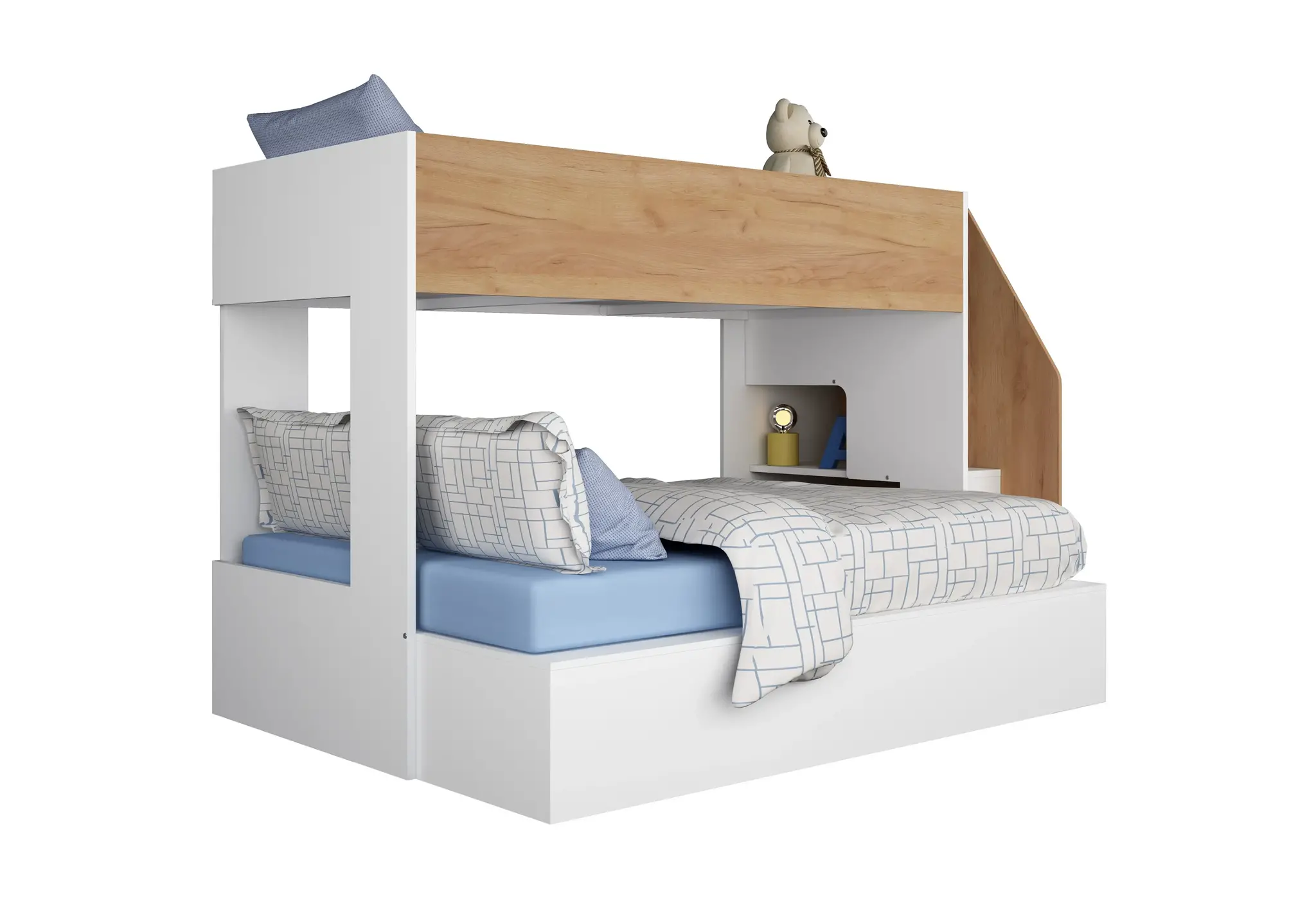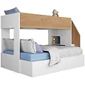 Dit slimme bed heeft twee gewone bedden boven elkaar – perfect voor logeerpartijtjes of een groter gezin. Het frisse design in eikenkleur met wit past in elke kinderkamer en maakt het meteen gezellig.